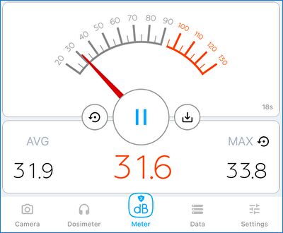 ▼こちらは iPhone アプリ「デジベル X」にて計測の、製品に内蔵のファンの音量です。ファンを2個装備していることもありますが、平均約46dBと就寝時に妨げとなりそうな大きな音量です。