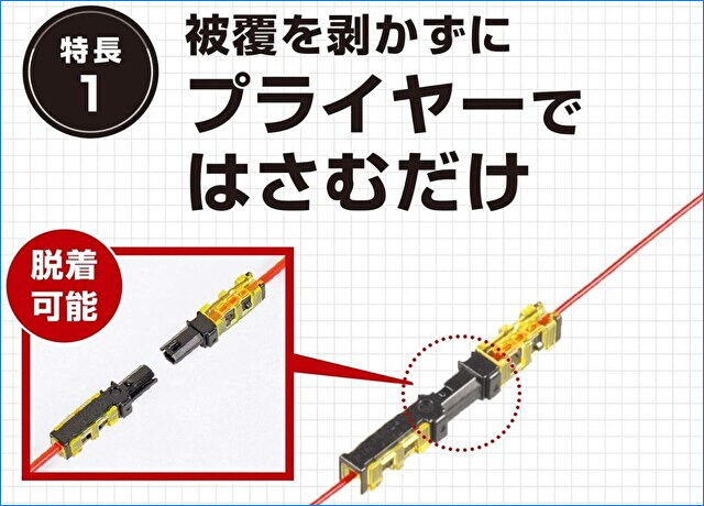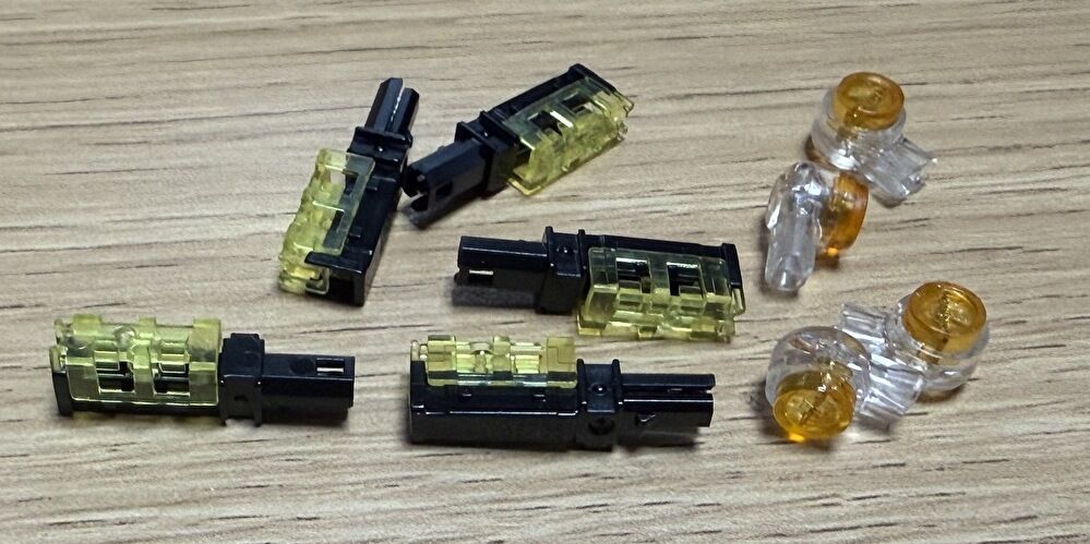 ▼購入時によく調べていなかったのですが、コネクターの形状・サイズ・ケーブルの順序が異なり、このままでは使用できません。このため、標準装備のコネクター(白)を活かすべく、ケーブルを切断し後述の接続コネクターを使用しました。