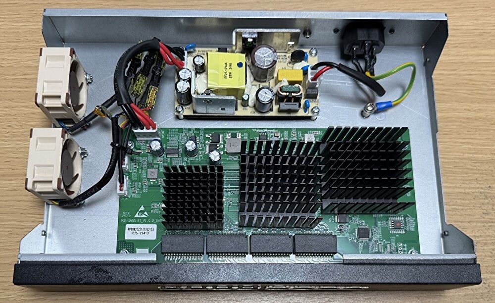 購入した10gbps スイッチングハブは、以下の10G RJ45 8ポートを装備の「FOXNEO」の製品です。2026年2月21日現在のAmazon クーポン価格 28,481円と、10G 8ポートとしては低価格な製品ですが、4020サイズのファンを2個装備しており、交換した「Noctua NF-A4x20」のファン 2個の価格は 5,540円。合計 34,021円です。