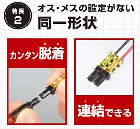 ▼左が購入したエーモンの接続コネクター、右がファンに付属の接続コネクターです。