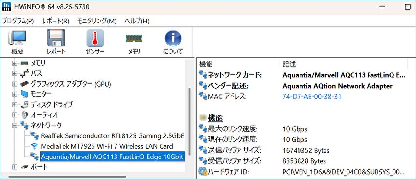 ▲▼フリーソフト「HWiNFO」の情報ですが、前述のとおり Marvell AQC113のチップです。なお、NAS用としてインストールしたTrueNASでは認識しませんでした。
