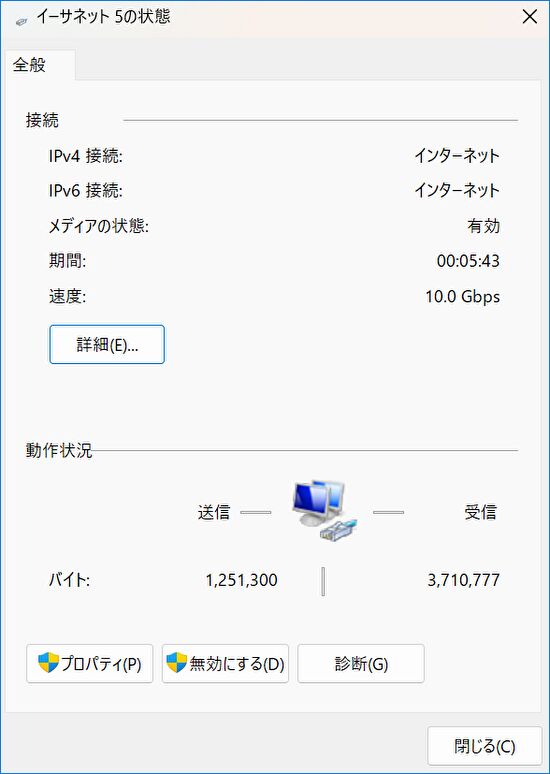 ▼ドライバーをインストールすることなく認識し安定動作していますが、速度は5.2Gbpsと MacとWindows 11 PCと比較すると控えめな速度です。現在のところ、ドライバーなどの設定を見直し中。なお、前述のとおり、UbuntuをインストールしたPCをNASとして使用、常時電源オンで使用していますが、この場合にも安定動作しています。