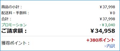 あらためての価格情報です。2026年1月15日現在、Amazonの表示価格は 37,998円ですが、自動的に8%割引が適用となり、34,958円での販売です。2024年3月にこちらにおいても本製品の記事を投稿していますが、当時の価格は 39,998円。メモリ価格高騰のなか、当時よりも 約5千円安での販売です。
