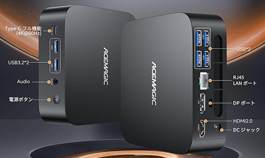 | ポート類 | USB Type-C 映像出力対応、USB-A 3.2 Gen 2 x 2、USB-A 3.2 Gen 1 x 4、HDMI、DP、1Gbps RJ45 イーサネット、3.5mm オーディオジャック |