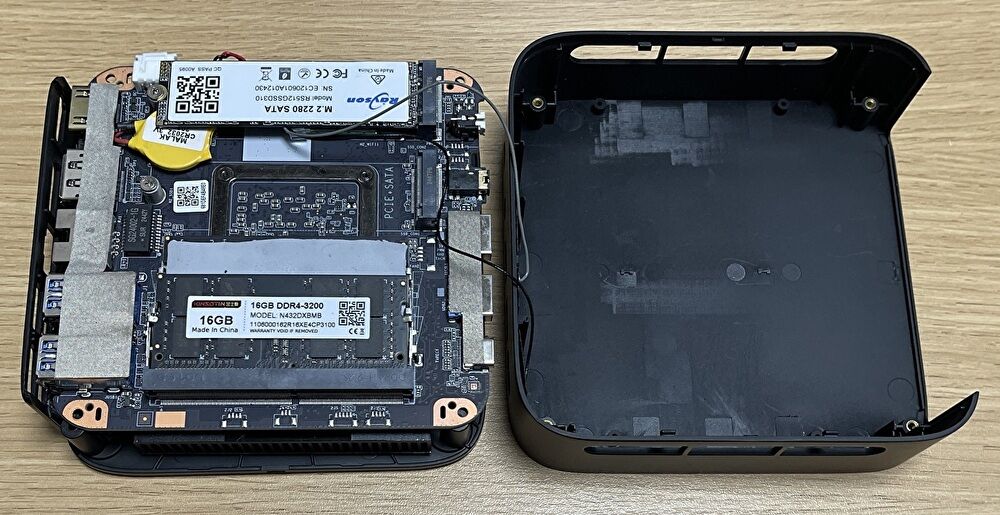 - 筐体は樹脂製となりますが、N100やN150のミニPCよりも ズッシリとした重厚感あり。