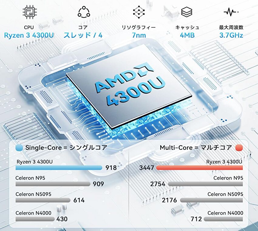 | CPU | AMD Ryzen 3 4300U、4コア 4スレッド、最大 3.7GHz |