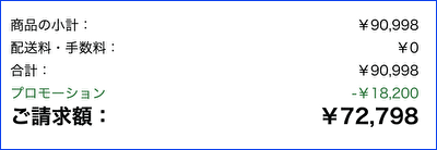 2026年2月7日現在、Amazonではクーポンと注文確定時に20%割引の2つの割引情報が掲載されています。実際に確認したところ、2つが併用となるのではなく、後者の20%割引が適用となり 72,798円での販売です。