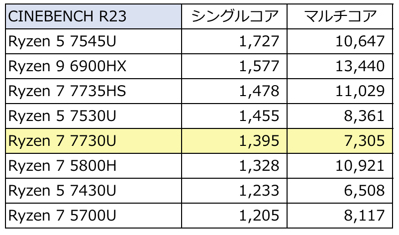 ▼Zen 3 アーキテクチャ、8コア 16スレッドのCPU「Ryzen 7 7730U」を搭載する本製品 実機で計測の、CINEBENCH R23のスコアです。「シングルコア 1395、マルチコア 7305」と、Ryzen 7 7730Uの響きほど高いスコアではありません。ただし、これまでのエントリークラスのPCに搭載事例の多い Ryzen 5 7430Uよりも やや高いスコアです。いづれにしても、動画視聴やブログ記事の編集、リモートワークのExcelなどではサクサクと動作します。