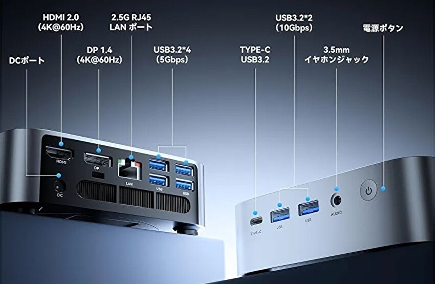 | ポート類 | USB-C 3.2(映像出力対応)、USB-A 3.2(5Gbps) x 4、USB-A 3.2(10Gbps) x 2、HDMI、DP、RJ45 2.5G 有線LAN |