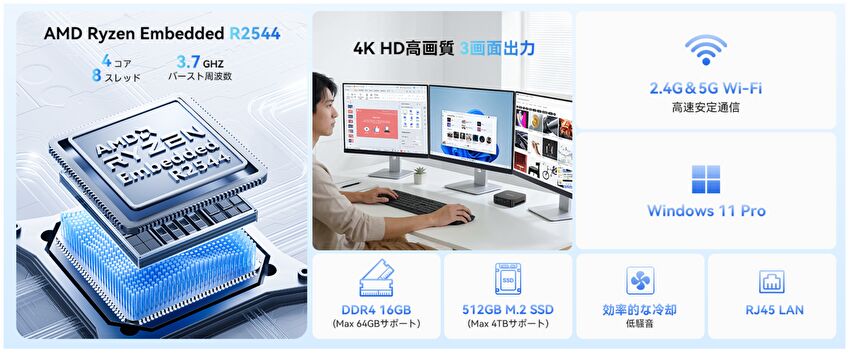 CPU AMD Ryzen Embedded R2544、Zen+、4コア 8スレッド、最大 3.7GHz