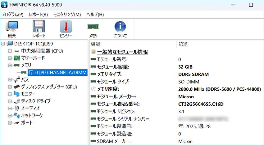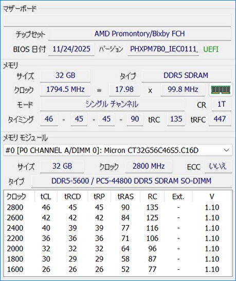 ▼メモリの情報ですが、DDR5 32GBは 16GB x 2の2枚と思いきや、32GB 1枚のシングルチャンネルの動作でした。後ほど、側板を外して確認した写真を掲載していますが、大手ブランド「Crucial」のメモリです。