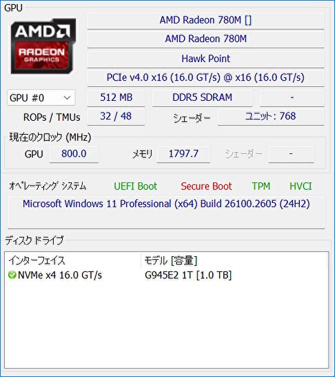 ▼統合型GPUは AMD Radeon 780M Graphicsです。780Mでは軽めのゲームを ある程度 プレイすることもできます。