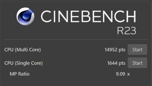 CINEBENCH R23のスコアは「シングルコア 1644、マルチコア 14952」。