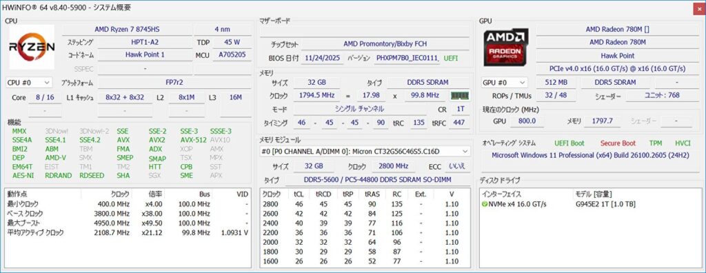 ▼上の画像からCPUの情報を拡大。AMD Ryzen 7 8745HSは、Zen 4 アーキテクチャ、8コア16スレッド、4nmプロセス、TDP 45W、L3 キャッシュ 16MB