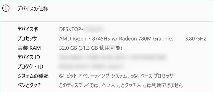 ▼Windows 11「設定」の「デバイスの仕様」より。もちろん、販売ページの製品仕様どおりに、AMD Ryzen 7 8745HS、Radeon 780 Graphics、メモリ 32GBです。