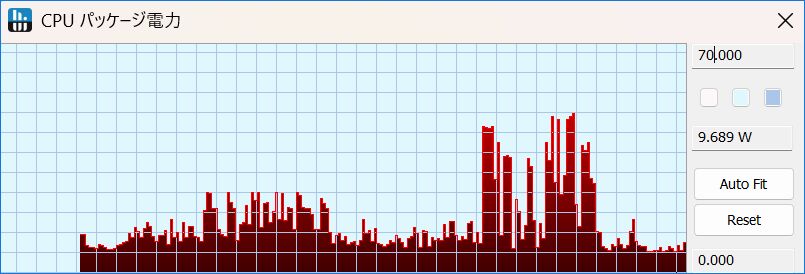 ▲▼この確認方法でよいものか 検証したものではないのですが、上の記事にて紹介のフリーソフト「HWiNFO」にて計測の、CPU パッケージ電力の推移です。Geekbench 5の計測時のグラフですが、左側が「サイレントモード」、右側が「パフォーマンスモード」です。「パフォーマンスモード」においては 45W前後となることが多く、しっかりと機能しているように思われます。