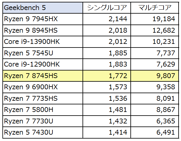 AMD Ryzen 7 8745HSを搭載する本製品にて計測のベンチマークスコアを掲載します。比較対象のCPUのスコアは、表形式にて掲載していますが、 以下の記事にて実機レビューのRyzen 9 8945HS、Ryzen 5 7545U、Ryzen 7 7735HSなどです。