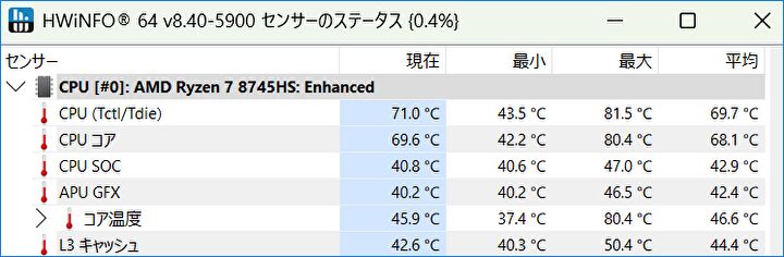 ▼CINEBENCH R23にて、CPU使用率を100%として際の CPU温度です(フリーソフト「HWiNFO」にて計測)。最大でも 81.5℃と、十分に許容範囲です。
