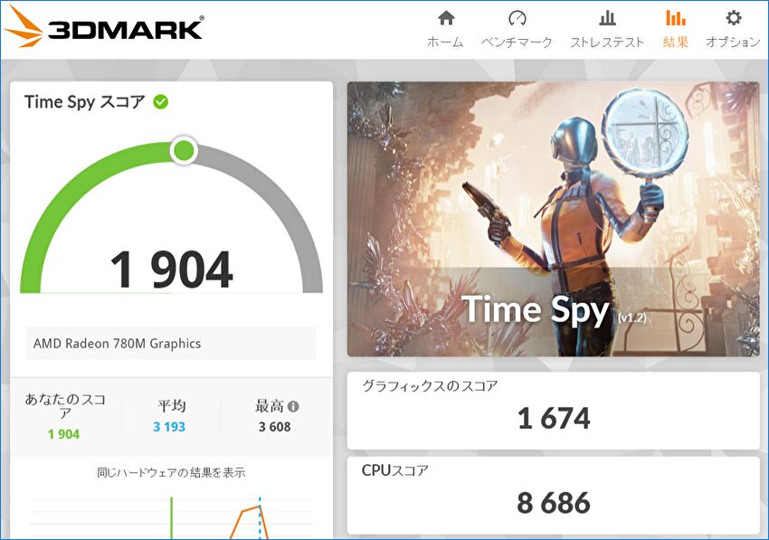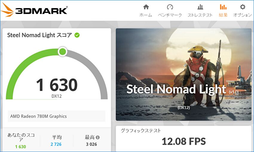GPUは統合型のAMD Radeon 780Mですので、負荷の大きいゲーム向けではありませんが、3DMARKのSteel Nomad LightとTime Spyのスコアを掲載します。統合型GPUとしては高いスコアです。