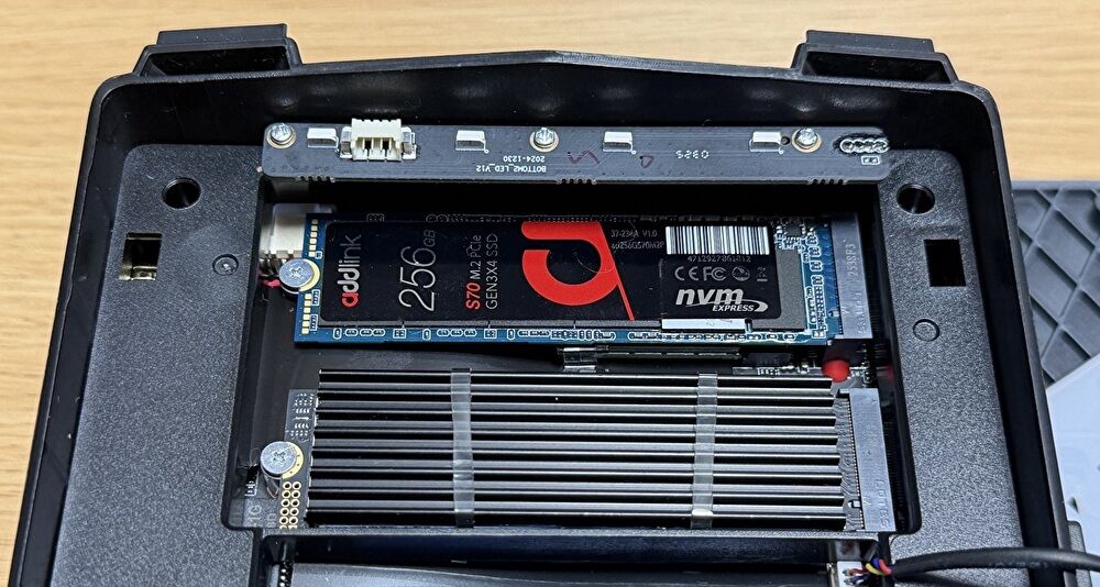▼標準装備のM.2 SSDとDDR5 32GB メモリを取り外しました。2280サイズのM.2 SSDはヒートシンクとシリコンパッドが装着されており、これらを外しての型番確認まで行っていません。