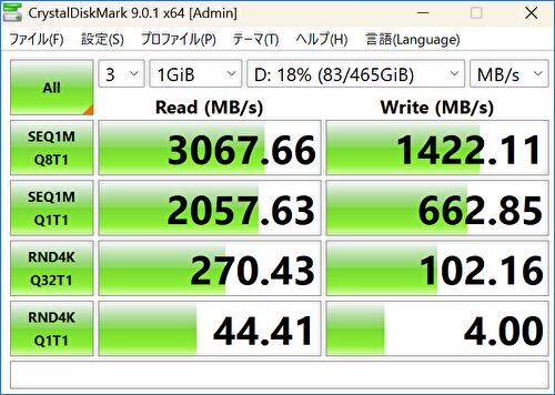 他のPCに当該ケース・SSDを接続した際と同水準の速度が出ています。PC内蔵時の速度は(こちらの記事にて掲載の)「Read 4,893MB/s、Write 4,067MB/s」ですが、USB4ポート経由と言えども、外付け時には本ミニPC への接続に限らず この水準です。