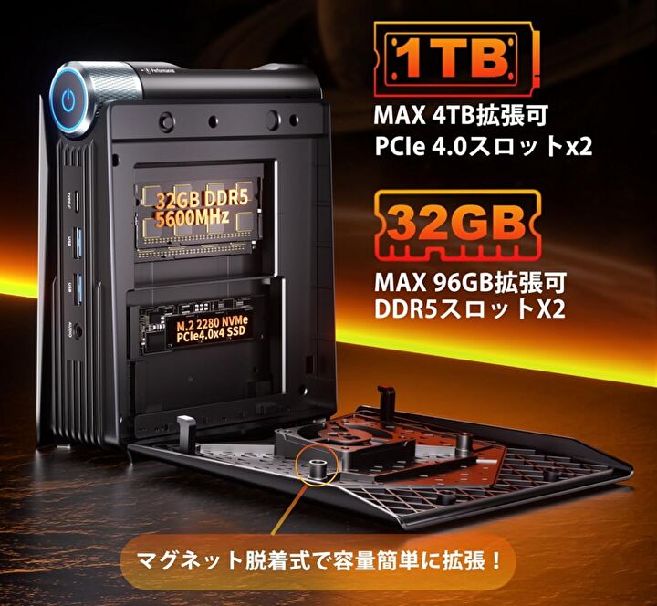デザインに大きな特徴のある製品ですが、マグネットの脱着式で簡単にメモリ・SSDにアクセスできること、電力モードの切替ダイヤルを装備など、利便性の高い製品です。また、メモリ・SSDの価格が高騰するなか、2026年2月8日時点のAmazon 価格 92,998円は格安と言えそうです。