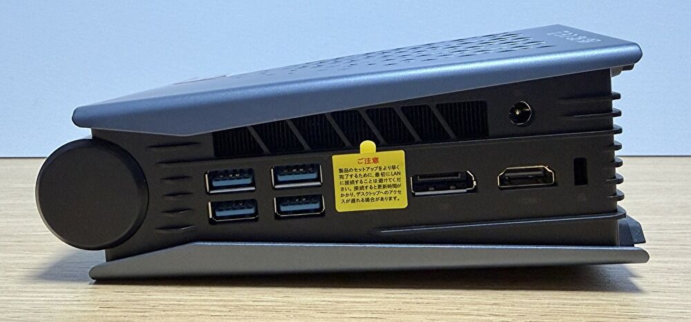 ▼映像出力は、前面のUSB4、背面のHDMIとDisplayPortの合計3系統。その他、2.5Gの有線LAN、USB-Aを6ポート装備しています。個人的に惜しいと感じる事項は OCulink ポート(ドッキングステーションの利用により、外付けグラボを USB4より速い転送速度で接続可能)を未装備であること。