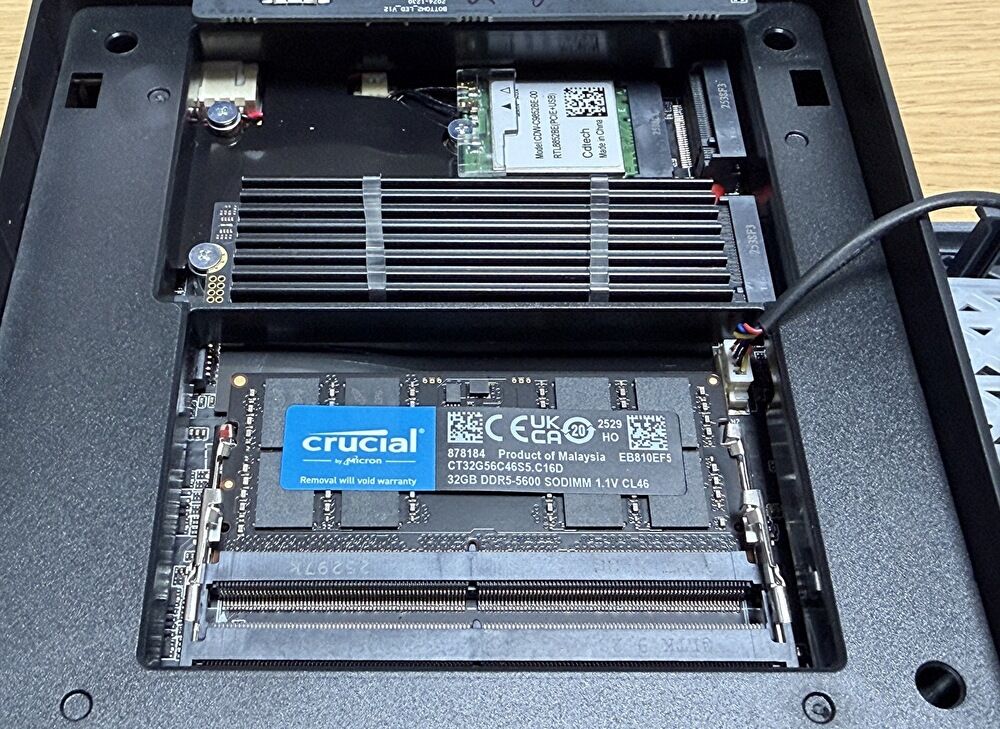 ▼メモリの型番は「CT32G56C46S5.C16D」。前述のとおり、CrucialのDDR5 32GBです。メモリ高騰の昨今であり、2026年2月1日現在のメモリ単体価格は約6万円。この価格を考慮すると、本製品「ACEMAGIC S3A」のAmazon 価格 92,998円(Amazon 販売情報はこちら)は格安です。