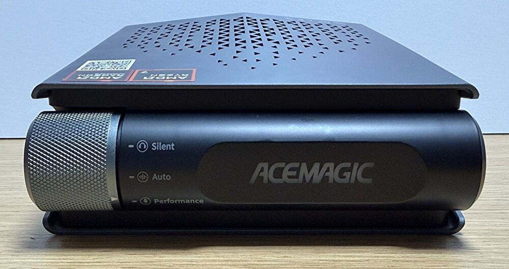 ▲▼上部には「ACEMAGIC」のロゴがあり、電源オンによりライトが透ける仕様です。私は派手なRGBライティングは好みでないのですが、サイドも含めて明るさは抑えられており、気になることはありません。なお、モード切替のダイヤルは、私が実機を確認するなかでは金属製です。