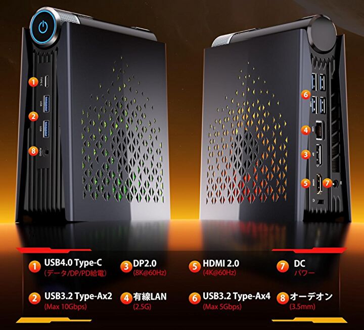 | ポート類 | HDMI、DisplayPort、USB4、USB-A 3.2 Gen 2 x 2、USB-A 3.2 Gen 1 x 4、2.5G 有線LAN |