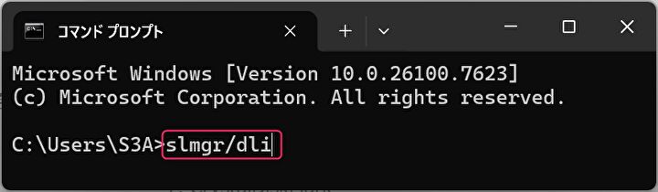 ▼コマンドプロンプトを起動し、最後の>のあとに「slmgr/dli」をコピペし、キーボードのエンターキーを押下します。