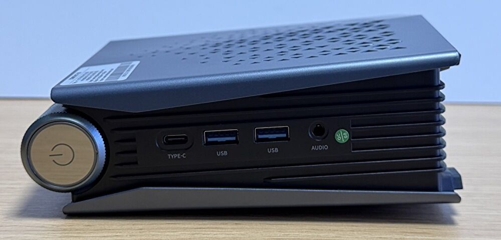 ▼電源ボタンのある前面より。ポート類は左から、USB4、USB-A 3.2(10Gbps) x 2ポート、3.5mm ヘッドホンジャック