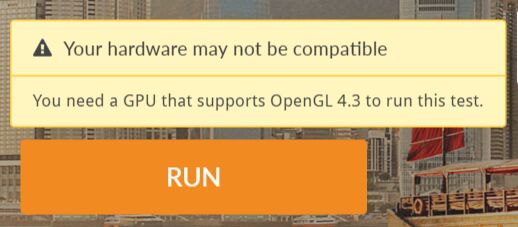 PCMARK10を何度かトライしてみたのですが、起動時に以下の「You need a GPU that supports OpenGL 4.3 to run this test.」となり、起動エラー・計測エラーが生じ、計測できず。