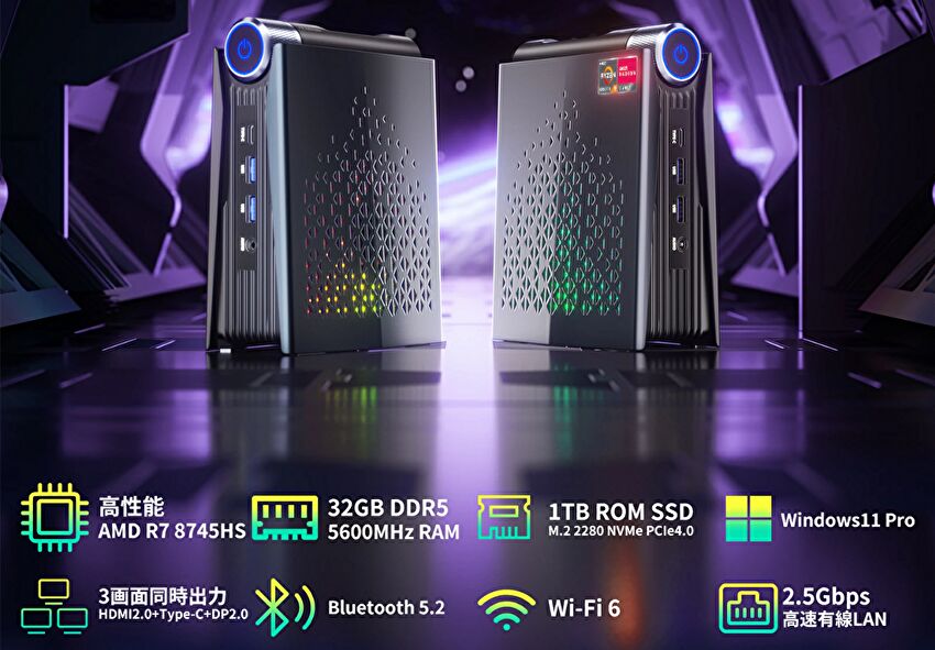 | CPU | AMD Ryzen 7 8745H、8コア 16スレッド、最大 4.9GHz |