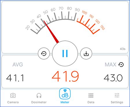 ▼同じく CINEBENCH R23にて負荷をかけた際のファン音量です。iPhone アプリ「デジベル X」での計測ですが、ベンチ計測時のファン音量の平均は約41dB。やや喧しく感じる音量ですが、ベンチ終了後には即静音となり、また、普段使い時には ほぼ無音のために、課題とはなりません。