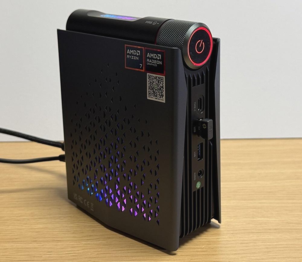 今回 実機レビューする製品は、CPUにAMD Ryzen 7 8745HS、DDR5 メモリ 32GB、1TB SSDを搭載するミニPC「ACEMAGIC S3A」です。上の写真のとおり、筐体のデザインも特徴となる製品ですが、マグネット脱着式のサイド板を開くことにより、メモリとM.2 SSD スロットに簡単にアクセス可能です。また、電源ボタンは電力モードの切替、調整ボタンも兼ねており、利便性の高い製品です。