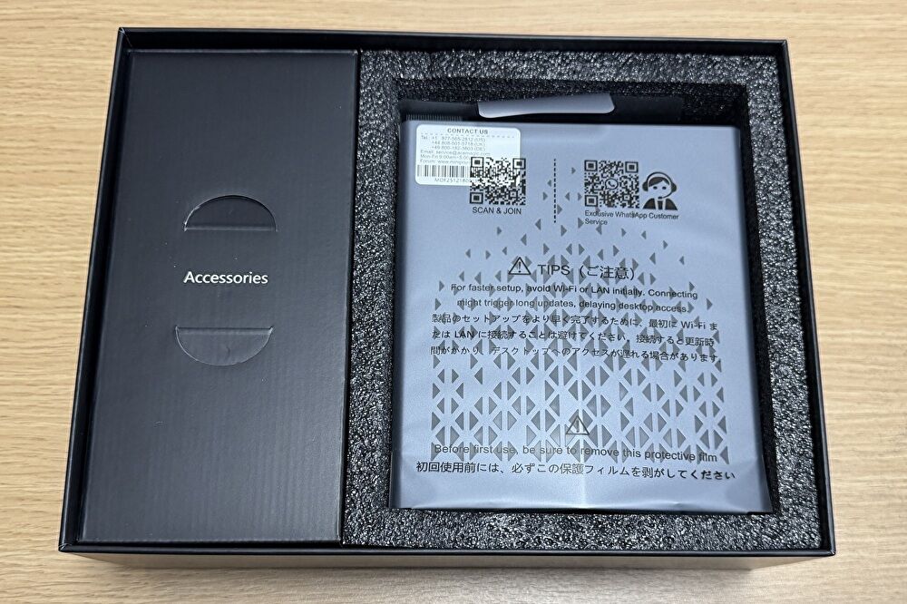 ▼ミニPCの場合、外箱を複数の製品と共用しているものが多いなか、本体のデザイン的なものもあり、専用の外箱です。