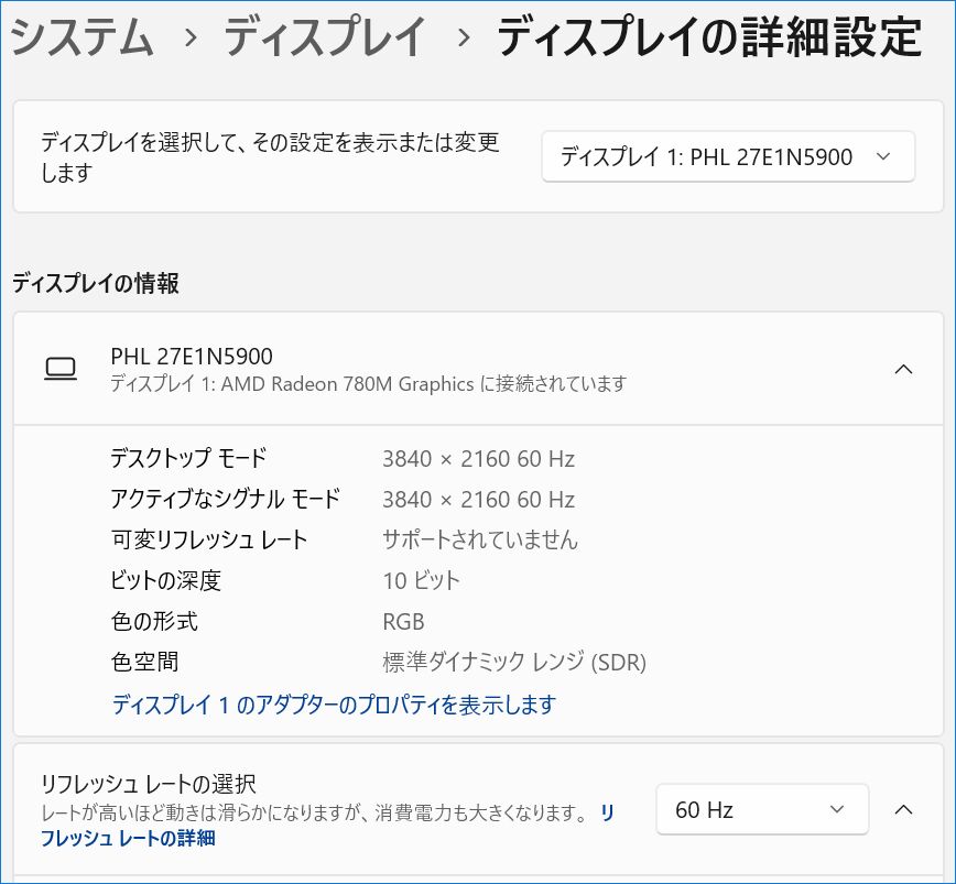 以下の記事にて実機レビュー、現在は終売となっている PHILIPSの27インチ 4K モニターへの接続です。Windows 11 「設定」画面のスクショの貼り付けのみですが、4K@60Hzにて安定動作しています。