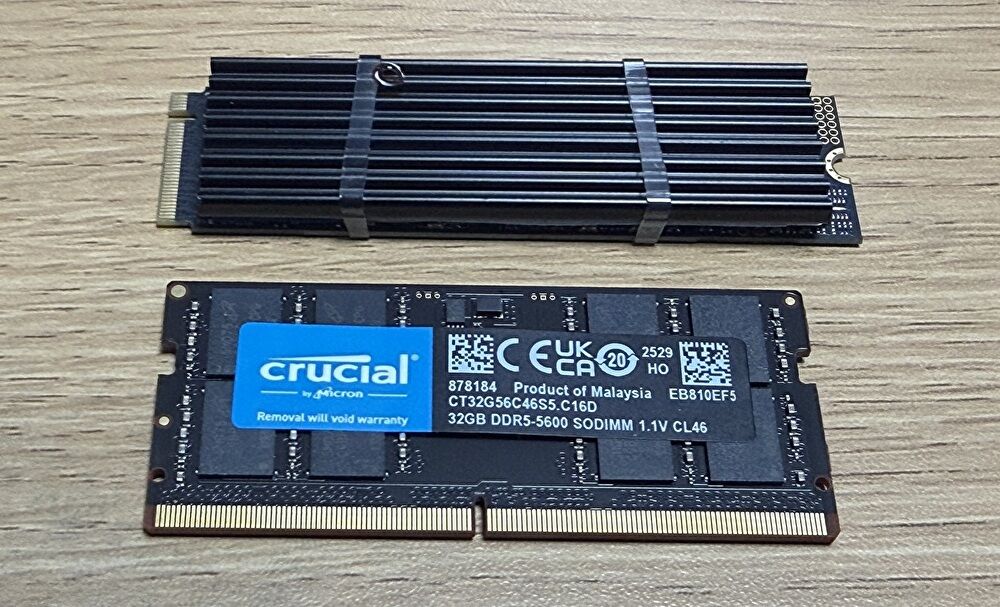 ▼写真のとおり、DDR5-5600のメモリは Crucialの32GB 1枚です。PCIe 4.0 SSDにはヒートシンクが取り付けられています。