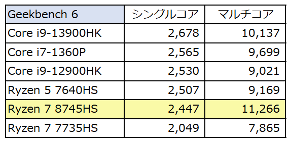 ▼私はRyzen 7 8745HSを搭載するPCの使用経験はないのですが、Geekbench 6 サイトから引用の同ベンチマークスコアの指標は以下です。その他は所有する実機で計測のスコアですが、普段使いでの体感レスポンスに影響するシングルコアのスコアは、概ね Ryzen 5 7640HSと同水準。もちろん、普段使いではサクサクと動作するレベルです。