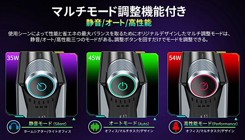 ▼「静音モード」「オート(バランス)モード」「パフォーマンスモード」を、BIOSやWindows 11のソフトではなく、調整ボタンを回すことにより切り替えできます。それぞれの動作音は順に、35dB、38dB、48dB。一般的には48dBでは喧しさを感じる水準です。