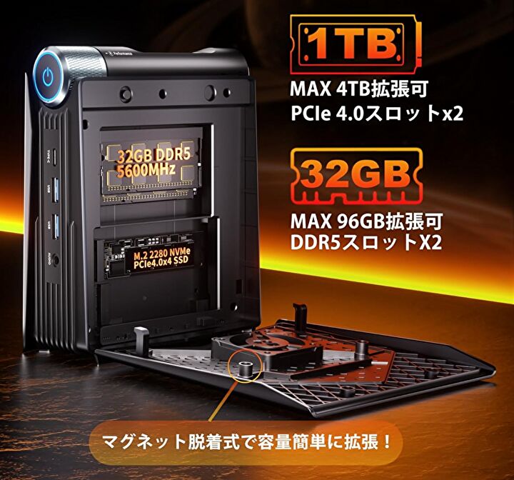 ▼正面から見て右サイドの側板はマグネット式となり、簡単に取り外し、メモリとM.2 SSD スロットにアクセスすることができます。国内通販で販売のモデルは、メモリは DDR5 16GB x 2の32GB、M.2 PCIe 4.0 x 4 1TBを装備しています。また、M.2 PCIe 4.0 SSDの空きスロットを備え、SSDを増設可能です。