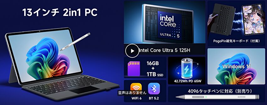 「ALLDOCUBE」より、13インチの2 in 1 Windows 11 タブレット「iWork GT Ultra」が発売となりました。13インチの液晶は 2.5K 解像度、CPUは Core Ultra 5 125H、メモリ 16GB、PCIe SSD 1TBと、2 in 1としてはハイスペックな構成です。また、フル機能のUSB Type-Cを2ポート装備し、バッテリーは65Wの急速充電に対応しています。