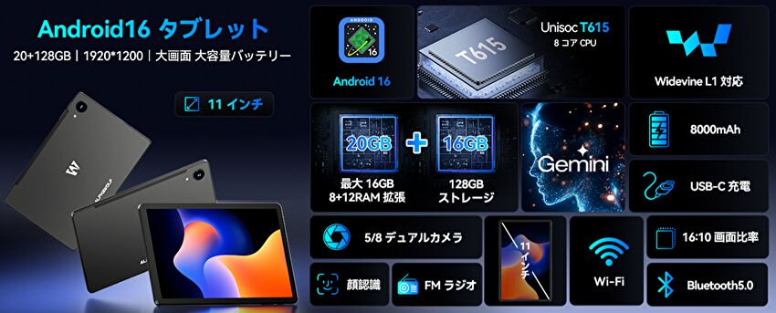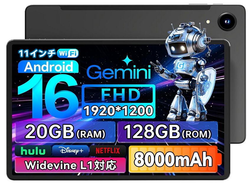 2025年12月21日現在、SoCにUNISOC T615を搭載する 11インチ Android 16タブレット「Alphawolf LPad3A」が、Amazonにて 13,998円で販売されています。この価格帯のタブレットでは、HD解像度の製品もありますが、本製品は FHDとなり、Netflixも含めた Widevine L1に対応しています。ただし、LTEに未対応のWiFi モデルです。