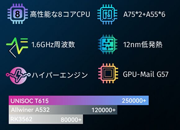 | CPU | UNISOC T615、8コア |