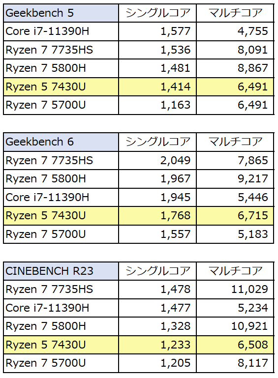 Ryzen 5 7430U、実機で計測のベンチマークスコア