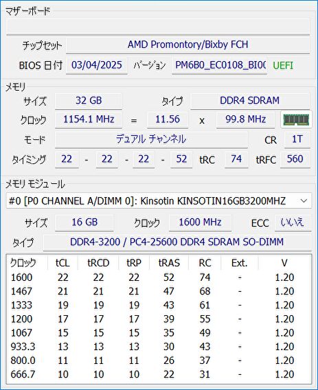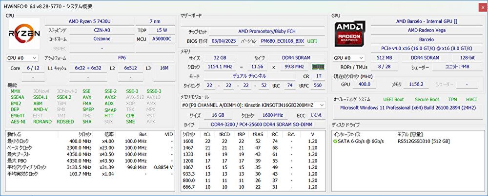 実機のシステム情報は、以下の記事にて紹介のフリーソフト「HWiNFO」から抽出したものを掲載しています。
