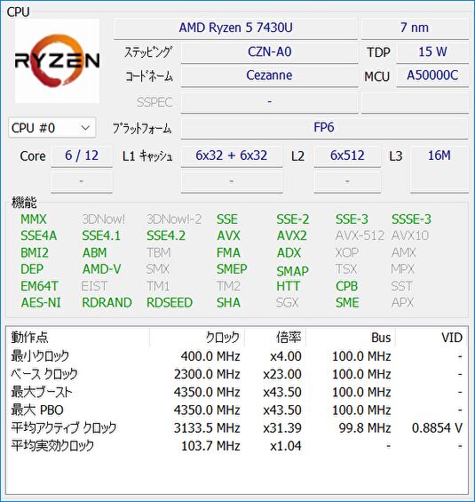 ▼上の画像からCPUの情報を拡大。AMD Ryzen 5 7430Uは、Zen 3 アーキテクチャ、7nm プロセス、TDP 15W、6コア 12スレッド、L3 キャッシュは16MBです。