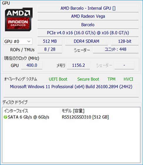 ▼統合型のGPUは、AMD Radeon Vega。ゲーム向けのGPUではありませんが、インテル 同クラスのCPUに搭載の統合型GPUよりも高性能です。