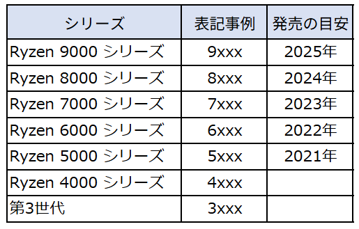 ▼①については、インテルでのCore i7、Core i5なの数値と同様に、階級的なものを示しています。Ryzen 3はエントリークラスですが、普段使いでバランスがよいのは Ryzen 5との認識です。